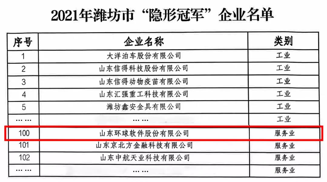 近日,喜報再次傳來——濰坊市工業(yè)和信息化局發(fā)布了《關(guān)于2021年度濰坊市“隱形冠軍”企業(yè)名單的通知》,經(jīng)過單位申報、市局推薦、專家評審、網(wǎng)上公示等程序,環(huán)球軟件被認(rèn)定為2021年濰坊市“隱形冠軍”企業(yè)。