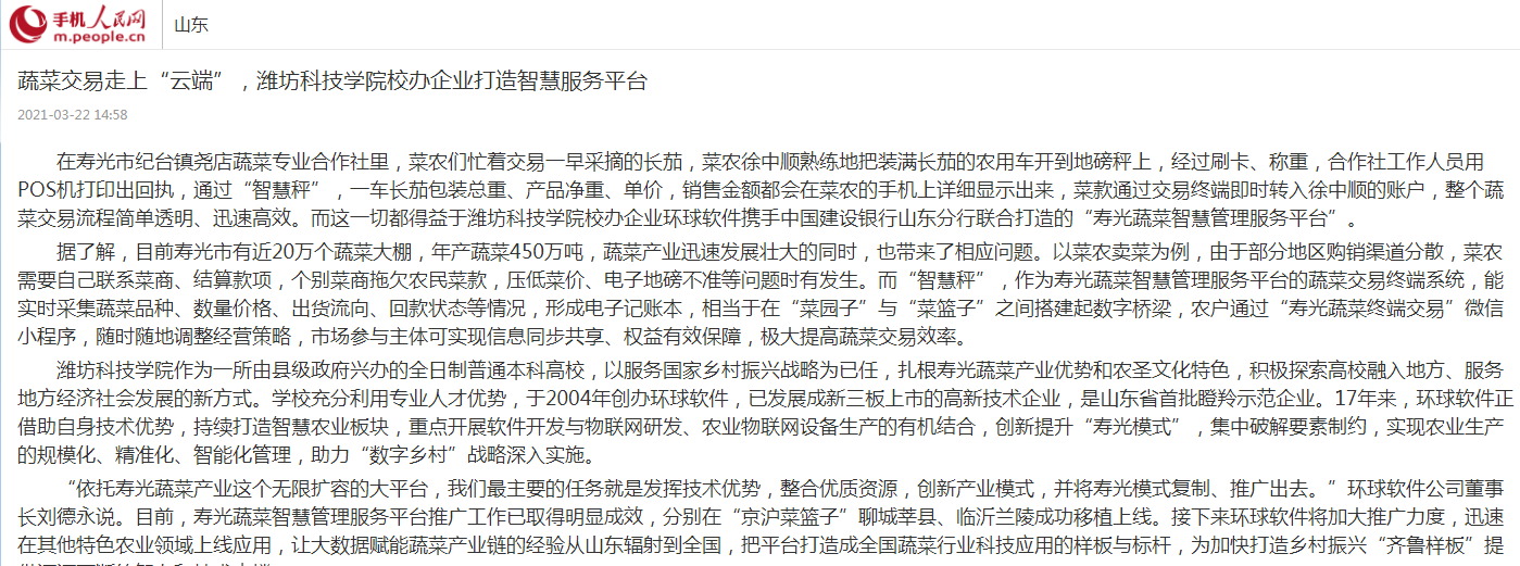 濰坊科技學(xué)院作為一所由縣級(jí)政府興辦的全日制普通本科高校,以服務(wù)國(guó)家鄉(xiāng)村振興戰(zhàn)略為已任,扎根壽光蔬菜產(chǎn)業(yè)優(yōu)勢(shì)和農(nóng)圣文化特色,積極探索高校融入地方、服務(wù)地方經(jīng)濟(jì)社會(huì)發(fā)展的新方式。學(xué)校充分利用專業(yè)人才優(yōu)勢(shì),于2004年創(chuàng)辦環(huán)球軟件,已發(fā)展成新三板上市的高新技術(shù)企業(yè),是山東省首批瞪羚示范企業(yè)。17年來(lái),環(huán)球軟件正借助自身技術(shù)優(yōu)勢(shì),持續(xù)打造智慧農(nóng)業(yè)板塊,重點(diǎn)開(kāi)展軟件開(kāi)發(fā)與物聯(lián)網(wǎng)研發(fā)、農(nóng)業(yè)物聯(lián)網(wǎng)設(shè)備生產(chǎn)的有機(jī)結(jié)合,創(chuàng)新提升“壽光模式”,集中破解要素制約,實(shí)現(xiàn)農(nóng)業(yè)生產(chǎn)的規(guī)模化、精準(zhǔn)化、智能化管理,助力“數(shù)字鄉(xiāng)村”戰(zhàn)略深入實(shí)施。