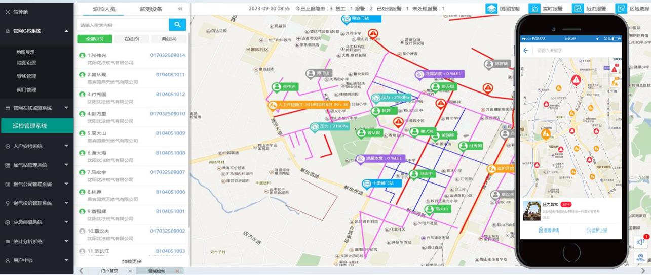 一張圖顯示管網(wǎng)、監(jiān)測設備、巡檢人員、存在隱患情況、 施工情況等信息,隨時抽查巡檢數(shù)據(jù),提高巡檢質(zhì)量。