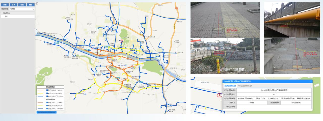 按管線年限,泄漏次數(shù),防腐破損次數(shù),埋深不足次數(shù),封閉占壓次數(shù),管網(wǎng)周邊環(huán)境等因素進行綜合評估,確定管段的風險等級,自動以不同顏色進行標記,形成管網(wǎng)風險情況分布圖。