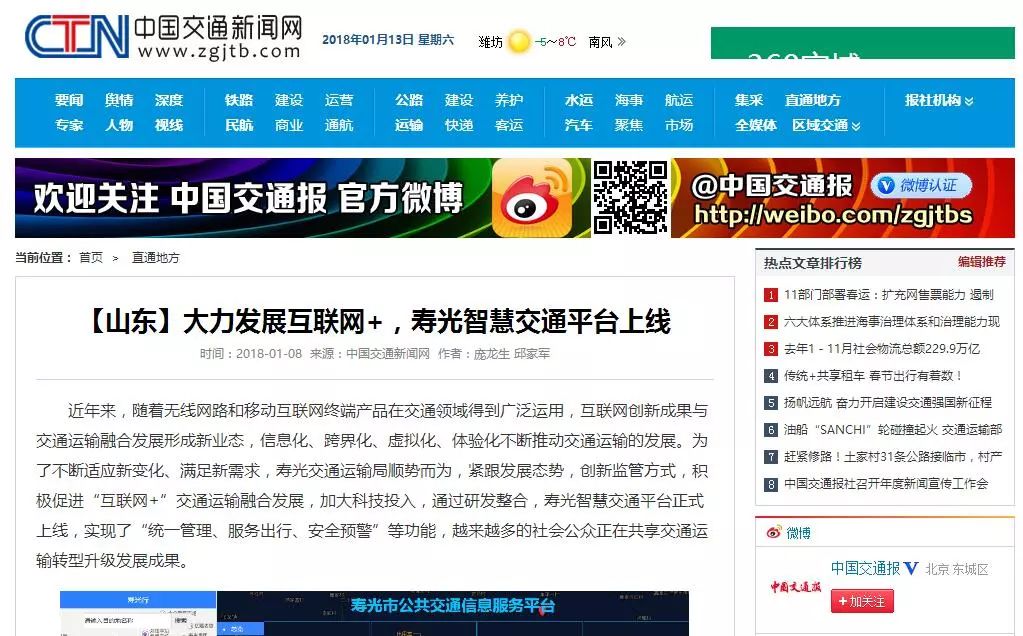 近日,由環(huán)球軟件研發(fā)并投入使用的壽光市智慧交通平臺在壽光交通運輸局正式上線。平臺憑借安全、準(zhǔn)確、高效的管理模塊和便捷的公眾出行功能引起了行業(yè)內(nèi)多家媒體的高度關(guān)注,其中,中國交通新聞網(wǎng)在“直通地方”板塊發(fā)文《【山東】大力發(fā)展互聯(lián)網(wǎng)+,壽光智慧交通平臺上線》,詳細(xì)介紹了壽光智慧交通平臺的上線實施情況,具體報道如下: