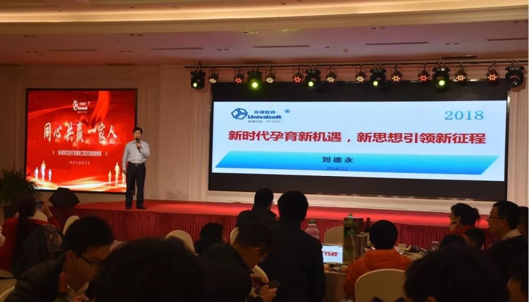 主持人宣布晚宴開(kāi)始,首先由環(huán)球軟件董事長(zhǎng)劉德永發(fā)表新年致詞,對(duì)全體員工及員工家屬表達(dá)了衷心的感謝以及新年的祝賀。
