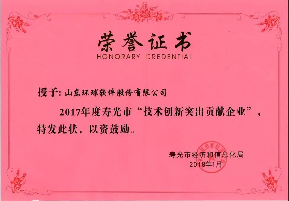 2月份, 環(huán)球軟件榮獲壽光市經(jīng)濟和信息化局授予的2017年度壽光市“技術(shù)創(chuàng)新突出貢獻企業(yè)”稱號,成為行業(yè)的“排頭兵”。