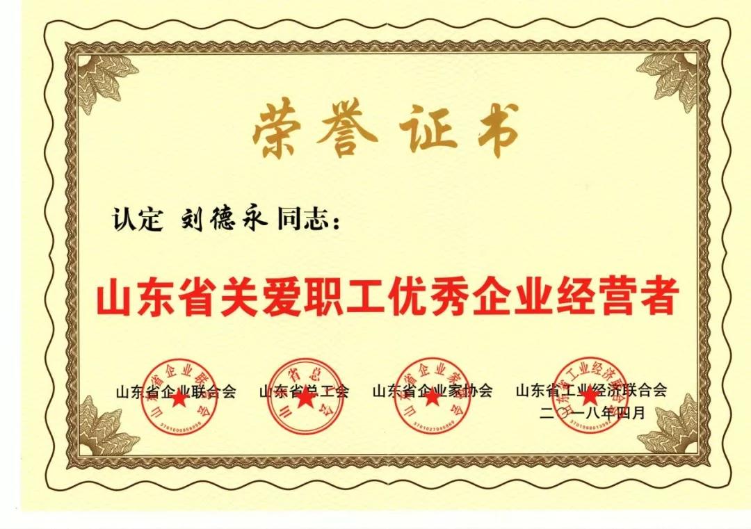 7月份,由省評委會評定,省企業(yè)聯(lián)合會、省總工會、省企業(yè)家協(xié)會、省工業(yè)經(jīng)濟聯(lián)合會決定, 對在2017年“以德立業(yè)、和諧興企”主題宣傳活動中表現(xiàn)突出的先進單位和個人進行通報表彰。董事長劉德永先生被評為“山東省關(guān)愛職工優(yōu)秀企業(yè)經(jīng)營者”。