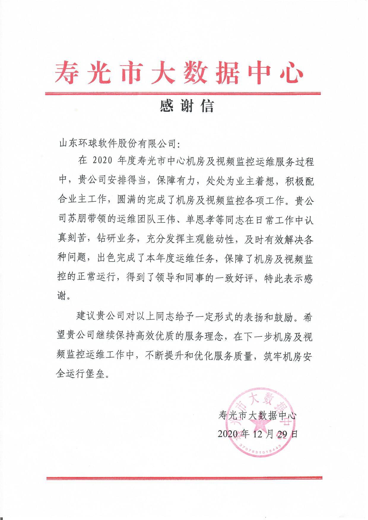 來自壽光市大數(shù)據(jù)中心的感謝信