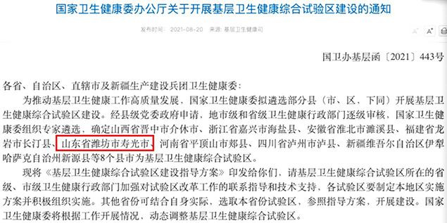 近日,國家衛(wèi)生健康委辦公廳發(fā)布《關于開展基層衛(wèi)生健康綜合試驗區(qū)建設的通知》,確定山東壽光市、山西介休市、浙江海鹽縣、安徽濉溪縣、福建長汀縣等8個縣市為基層衛(wèi)生健康綜合試驗區(qū)。濰坊壽光市是山東省唯一上榜縣市。
