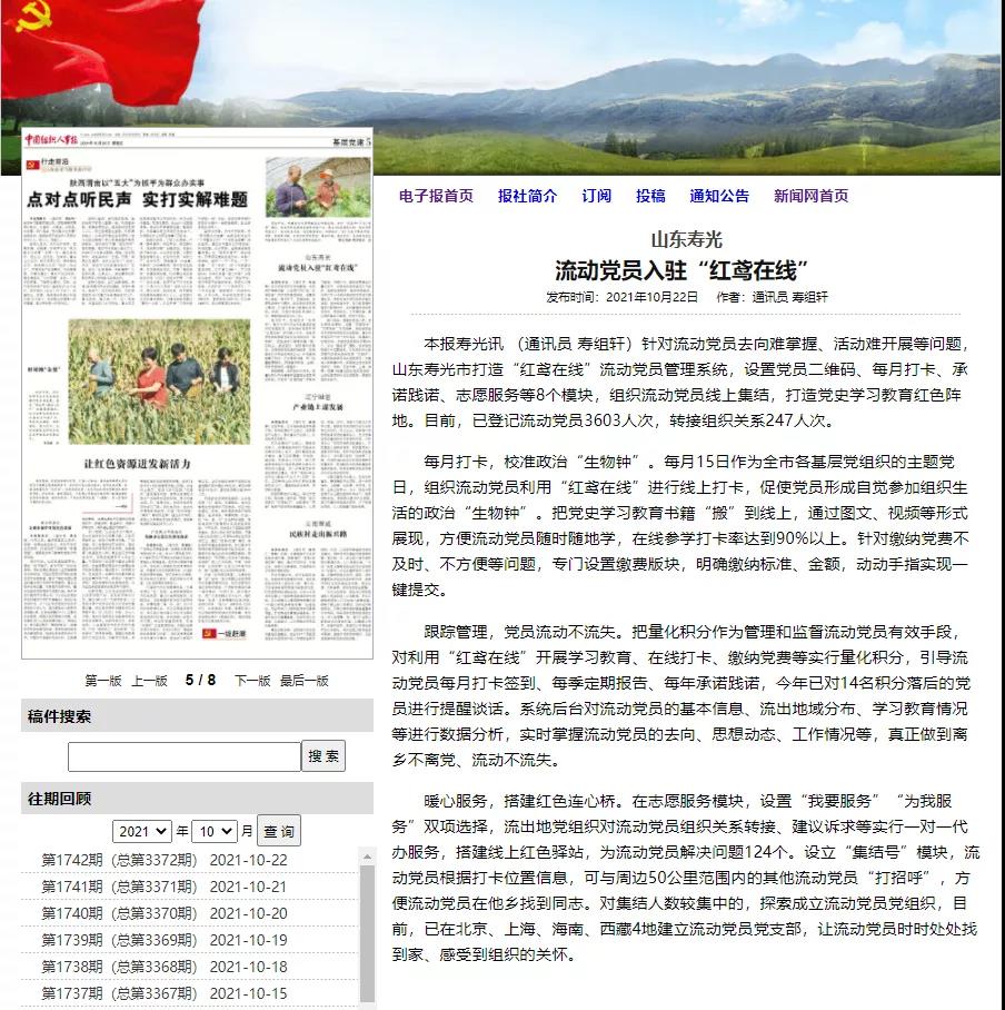 10月22日,《中國組織人事報》以《流動黨員入駐“紅鳶在線”》為題,刊發(fā)壽光市利用“紅鳶在線”系統(tǒng)教育管理流動黨員經驗做法?,F(xiàn)將全文刊發(fā),以饗讀者。