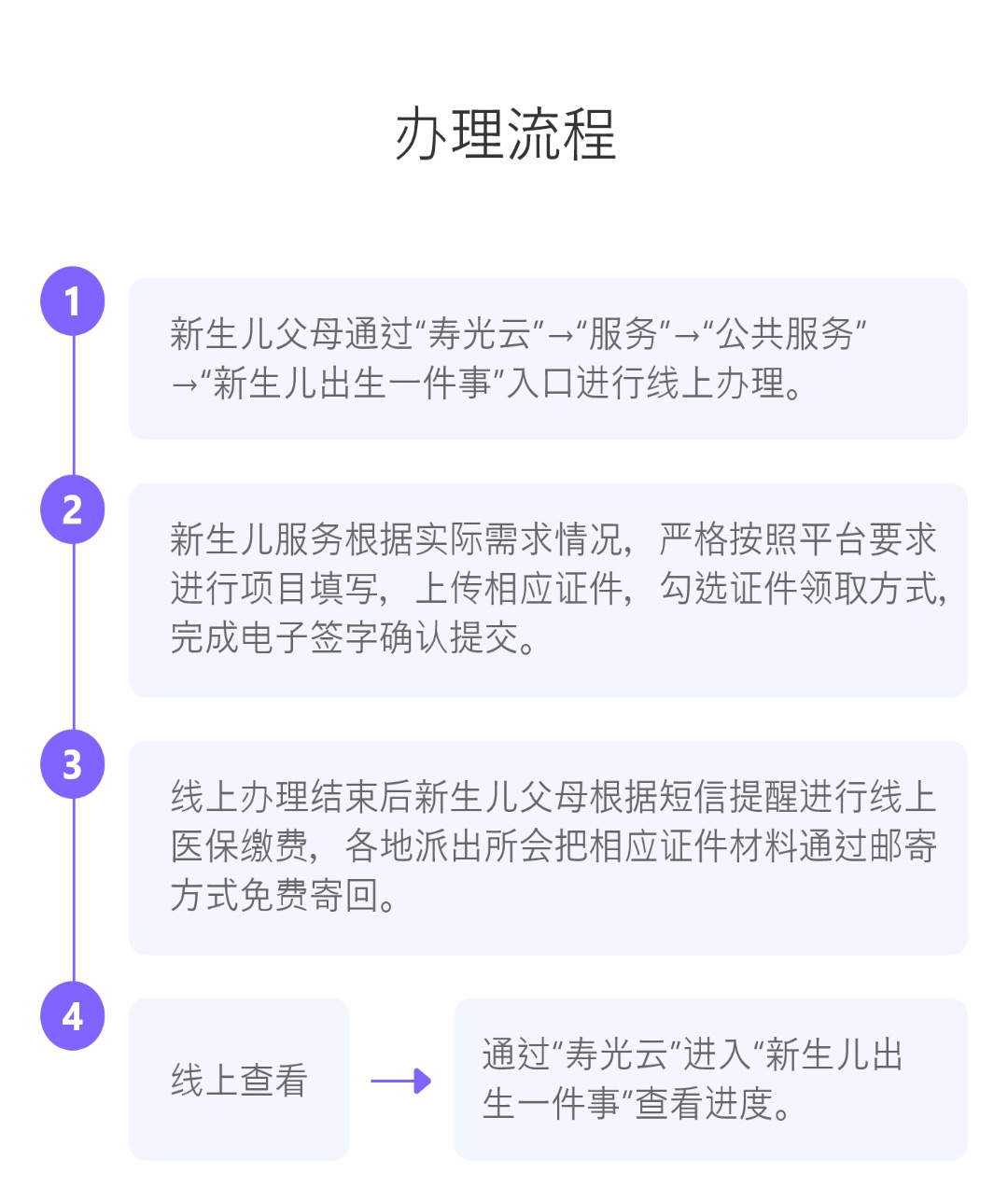 壽光市還推出“新生兒出生一件事掌上辦”服務(wù),充分利用移動(dòng)互聯(lián)網(wǎng)、大數(shù)據(jù)等技術(shù),開發(fā)建設(shè)新生兒出生一件事便民應(yīng)用,統(tǒng)一使用“壽光云”APP作為統(tǒng)一入口,群眾僅需通過手機(jī)在“壽光云”設(shè)置“一件事”專欄里提報(bào)申請(qǐng),按步驟操作即可辦理落戶、參保登記、參保繳費(fèi)“一件事”。通過實(shí)施壽光市新生兒出生一件事一次辦好改革,讓群眾眼中繁瑣頭疼的“一件事”最快僅需2小時(shí)就能完成,所有證件辦理過程僅需1至2個(gè)工作日,全過程均免費(fèi),真正實(shí)現(xiàn)“讓數(shù)據(jù)多跑路,讓群眾不跑腿”。