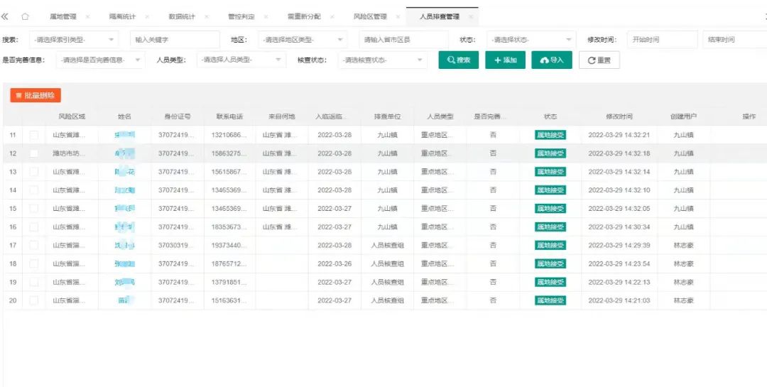 嚴格落實數據動態(tài)監(jiān)測防控措施,組織技術人員通宵達旦研發(fā)啟用“疫情防控人員摸排系統”,建立“公安大數據推送+網格排查+自主上報+群眾舉報+場所掃碼登記”5道人員摸排網,優(yōu)化“全域摸排—線上推送—線下核查—大數據分析比對”聯動機制,實現重點人員底數清,摸排任務明晰、屬地分配精準、流轉處置高效、管控措施不漏的目標,確保對風險人員能夠第一時間排查到位、管控到位。