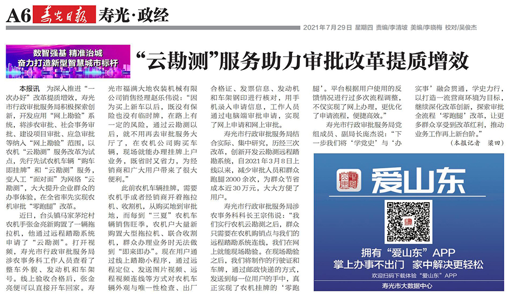 為深入推進(jìn)“一次辦好”改革提質(zhì)增效,壽光市行政審批服務(wù)局積極探索創(chuàng)新,開發(fā)應(yīng)用“網(wǎng)上踏勘”系統(tǒng),將涉農(nóng)審批、社會事務(wù)審批、建設(shè)項目審批、應(yīng)急審批等納入“網(wǎng)上踏勘”范圍,以農(nóng)機(jī)“云勘測”服務(wù)改革為試點,先行先試農(nóng)機(jī)車輛“購車即掛牌”和“云勘測”服務(wù),變?nèi)斯ぁ懊鎸γ妗睘榫W(wǎng)格“云勘測”,大大提升企業(yè)、群眾的辦事體驗,在全省率先實現(xiàn)農(nóng)機(jī)審批“零跑腿”改革。