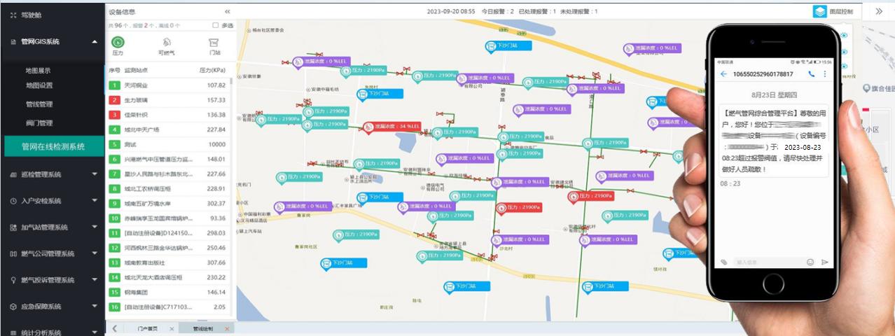 基于互聯(lián)網(wǎng)技術,將分散在各地的管網(wǎng)監(jiān)測點的數(shù)據(jù)(管網(wǎng)壓力、氣體泄露濃度等)實時傳送到監(jiān)控中心,形成以監(jiān)控中心為核心輻射整個管網(wǎng)的分布式監(jiān)控網(wǎng)絡,使在線監(jiān)測不存在盲區(qū)。指標出現(xiàn)異常時自動發(fā)送報警短信,將安全隱患撲滅在萌芽狀態(tài)。