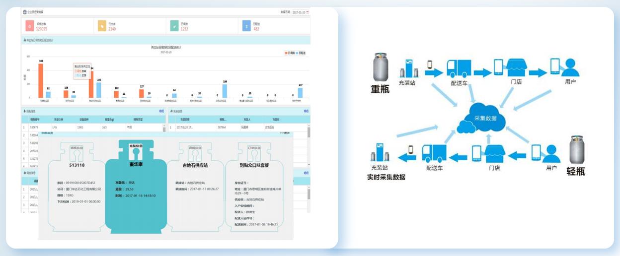 針對液化石油氣監(jiān)管的痛點,平臺為客戶建立了城市范圍內(nèi)鋼瓶從生產(chǎn)制造、充裝、檢驗、配送的全流程監(jiān)管方案。采用“一瓶一碼”、“一瓶一檔”的方式,實現(xiàn)追蹤溯源,解決了氣瓶充裝記錄智能化的問題。這種全流程監(jiān)管方案不僅提高了鋼瓶管理的效率和安全性,還確保了鋼瓶在全生命周期內(nèi)的有效監(jiān)控。